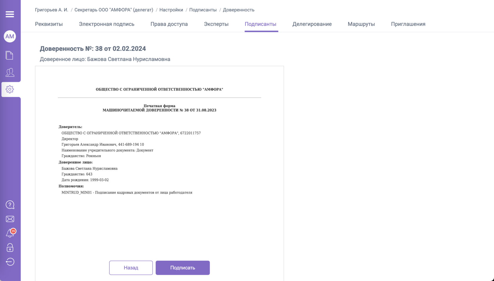 Подписание доверенности