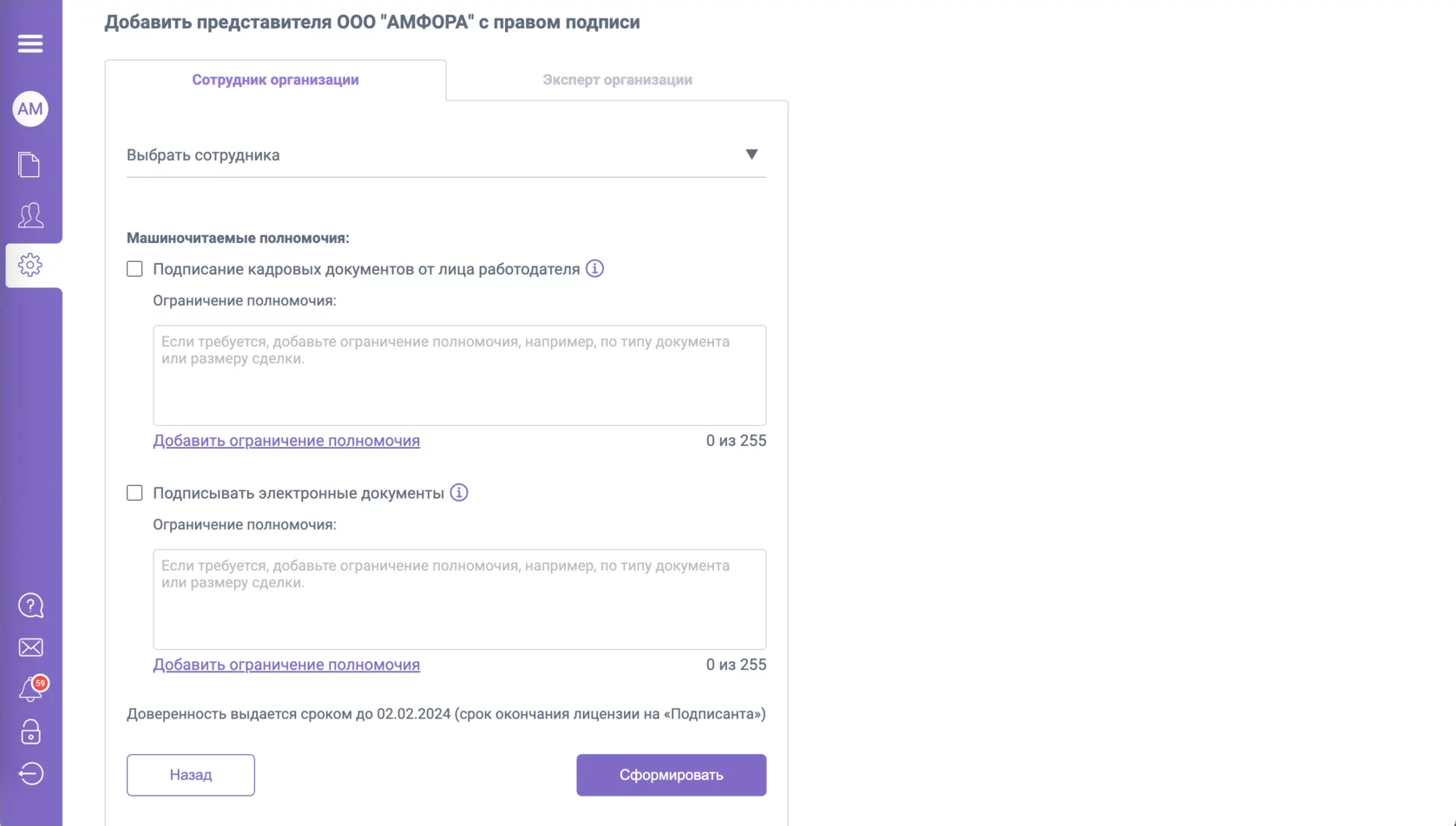 Срок действия доверенности устанавливается автоматически по дате окончания лицензии по тарифу «Подписант».