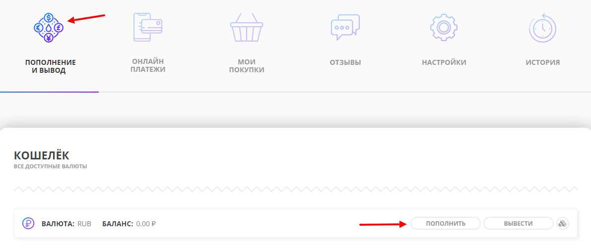По умолчанию клиент получает доступ к 5 счетам: RUB, EUR, KZT, UAH, USD. Удобнее работать с рублями, поскольку к ним предоставлено множество способов пополнения. Чтобы отправить деньги на баланс, нужно: