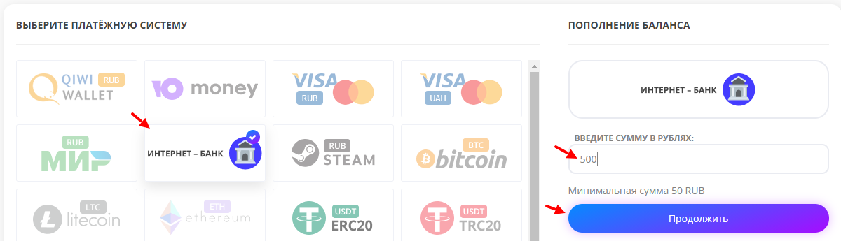 Шаг 3. Выбираете "интернет-банк" и вводите сумму пополнения (минимальный депозит 500 рублей для intrade).
