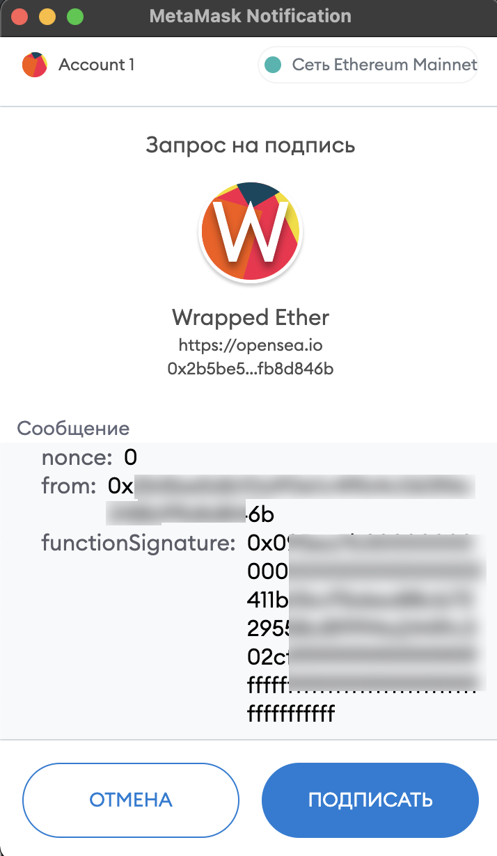 WETH (Wrapped ETH или обернутый ETH) – валюта, используемая во многих сделках на OpenSea. Получить Wrapped ETH можно конвертировав ETH в своем профиле на OpenSea или сразу переведя из другого источника.