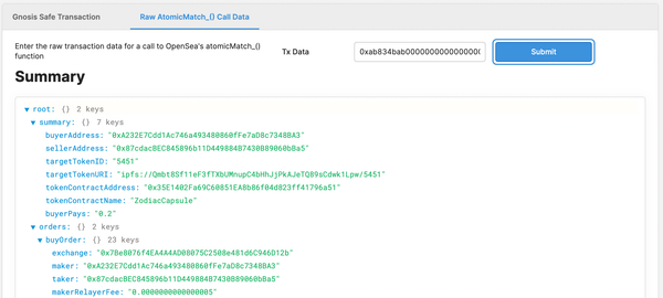 We’ve crafted a simple tool for parsing and ultimately reviewing calls to the Wyvern Exchange’s atomicMatch_ function. The utility is publicly available here and supports parsing direct calls to atomicMatch_() or unwrapping and parsing those calls from a transaction proposed to a Gnosis Safe.